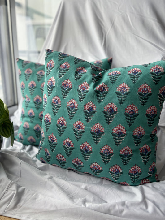 Teal Blue Block Printed Cushion Cover (Set of 2)