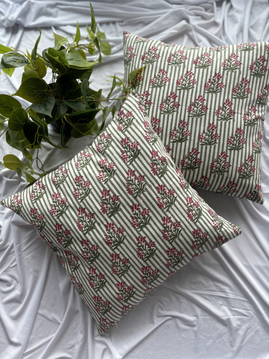 Striped Floral Block Printed Cushion Cover (Set of 2)