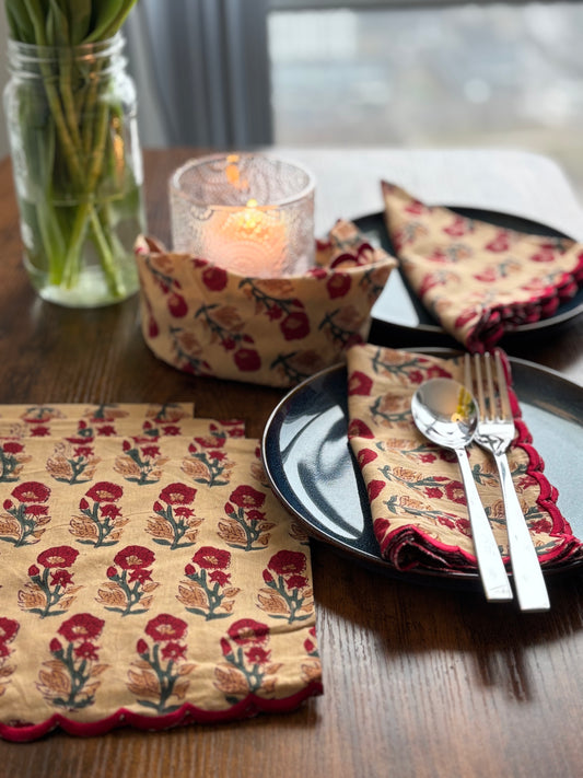Scalloped-edged Napkins (Taupe & Red)