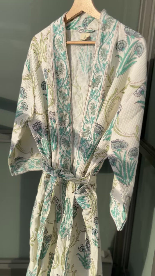 White and Blue Waffled Cotton Block Printed Robe
