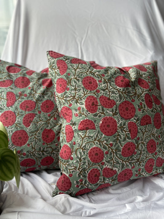 Green and Red Floral Block Printed Cushion Cover (Set of 2)