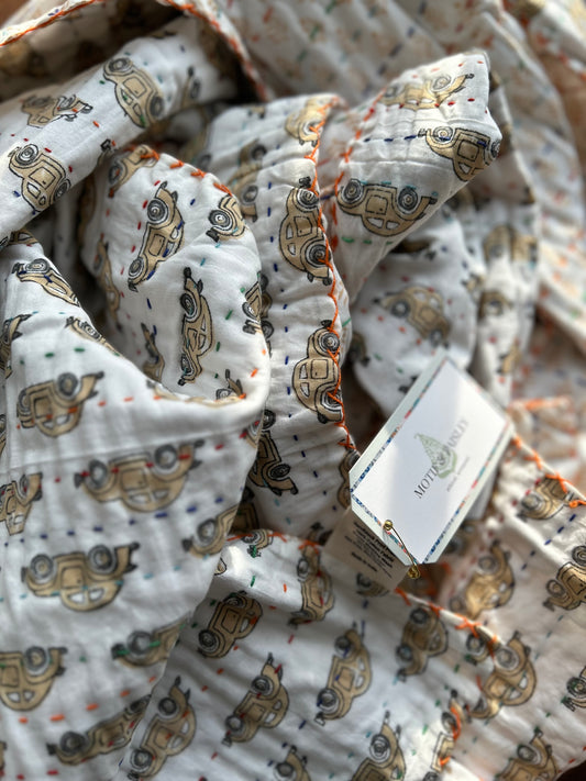 Keep your baby cozy and comfortable in these lightly quilted cotton blockprinted baby blankets. Curated from the softest cotton fabric, each blanket is unique with its own sweet details. We use azo-free, non-toxic dyes for blockpriting our cute patterns, making the blankets totally safe for your baby to snuggle.