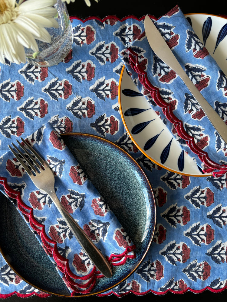 Firozi Blue & Red Scalloped Edge Table Napkin
