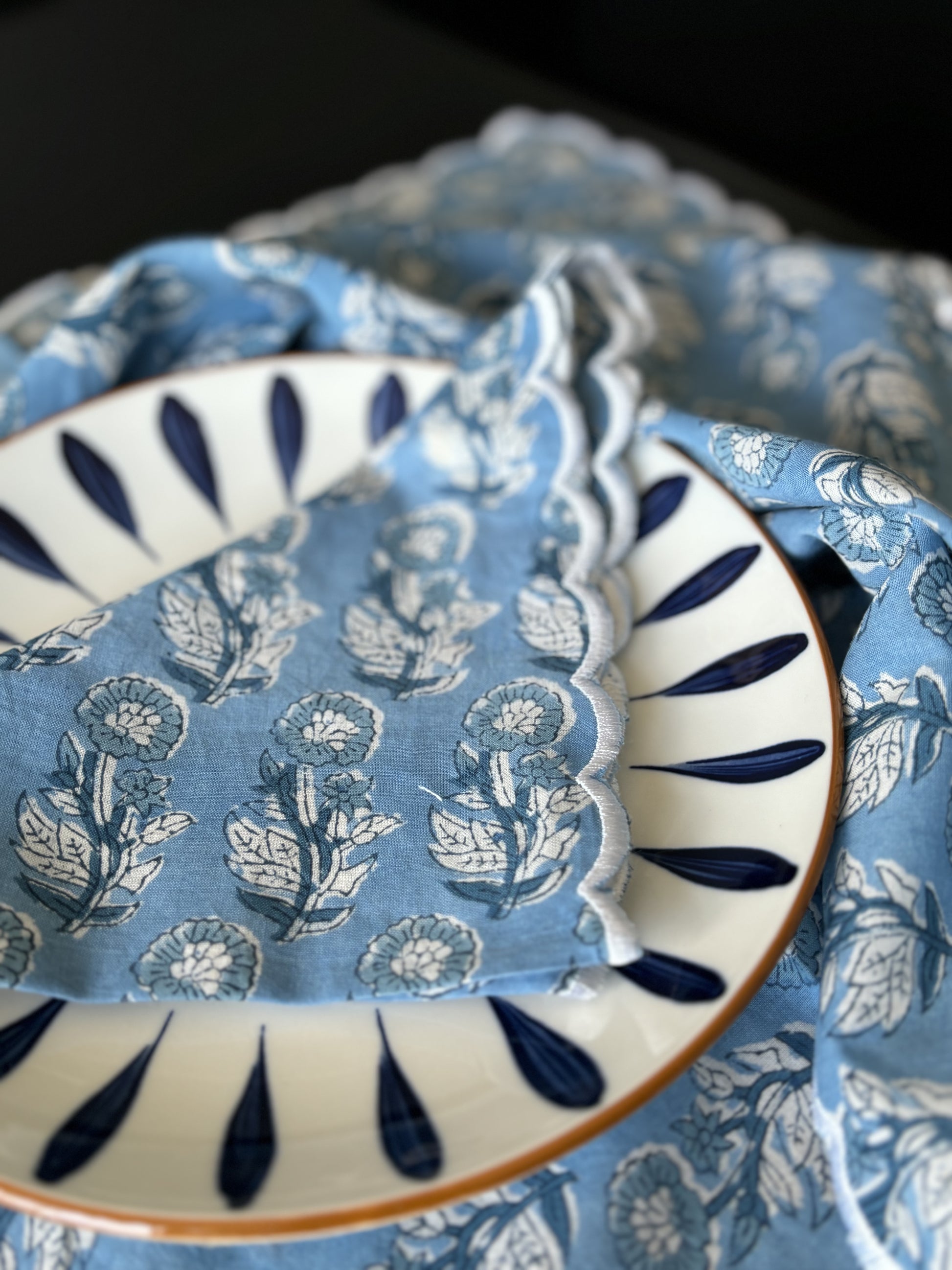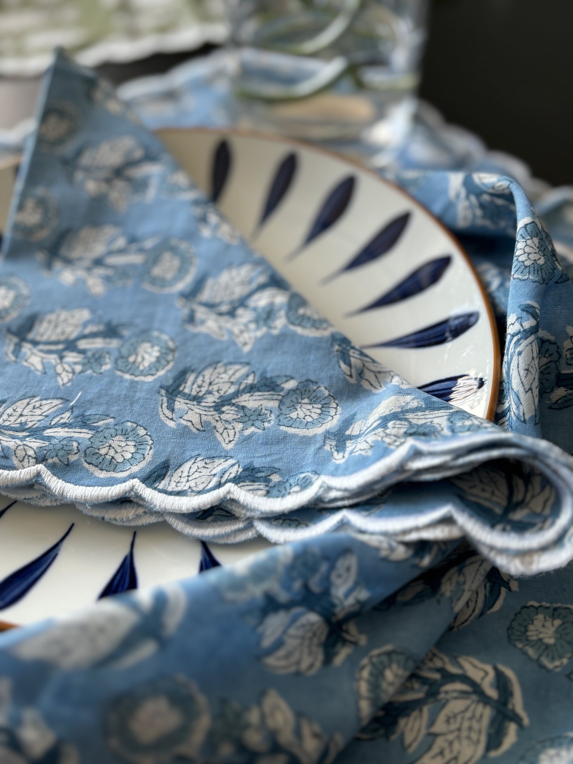 Elevate your Thanksgiving Dinner with our beautiful scalloped edged napkins. Made from 100% soft cotton fabric, featuring vibrant prints and designs.